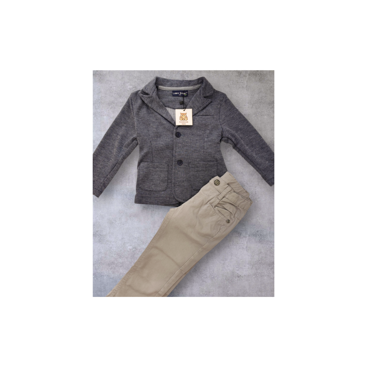 Κομψό αγορίστικο σετ με γκρι παντελόνι και σακάκι , ιδανικό για επίσημες εμφανίσεις. Το σακάκι διαθέτει μοντέρνα γραμμή και ποιοτικό ύφασμα, ενώ το παντελόνι προσφέρει άνετη εφαρμογή για άνεση όλη τη μέρα. Ένα διαχρονικό σύνολο που ταιριάζει τέλεια σε γιορτές, βαπτίσεις και ιδιαίτερες περιστάσεις.