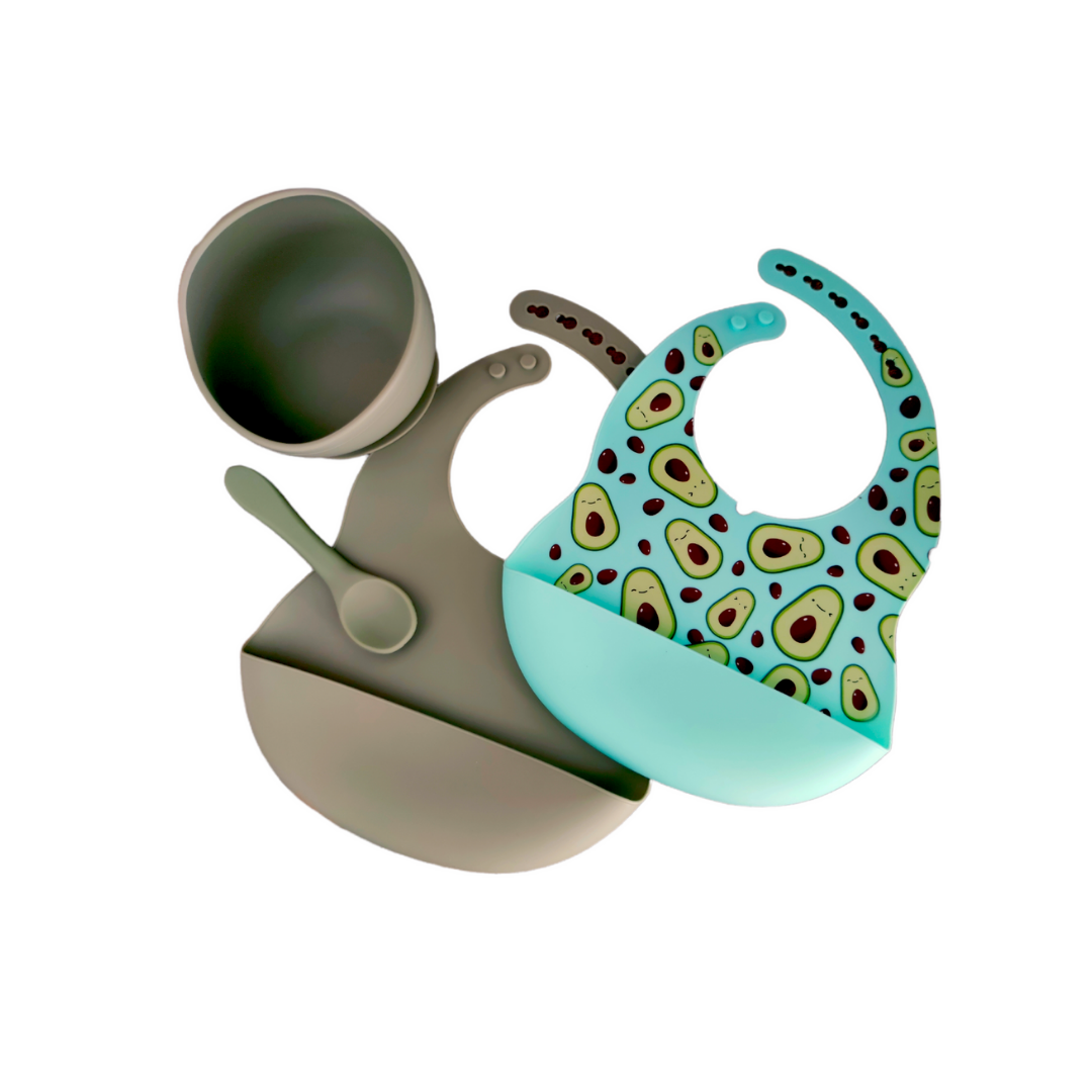 Το σετ φαγητού σιλικόνης αποτελείται από 4τμχ. (2 Σαλιάρες, μπολάκι με βεντούζα & κουτάλι σιλικόνης).