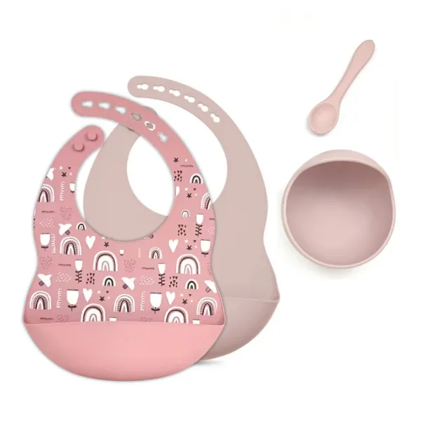 Το σετ φαγητού σιλικόνης αποτελείται από 4τμχ. (2 Σαλιάρες, μπολάκι με βεντούζα & κουτάλι σιλικόνης).