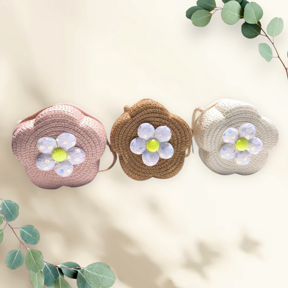Ψάθινο παιδικό τσαντάκι σε σχήμα μαργαρίτας, σε 3 γλυκές αποχρώσεις: λευκό, καφέ και ροζ. Ελαφρύ, με ρυθμιζόμενο λουράκι και φερμουάρ, ιδανικό για βόλτες και καλοκαιρινές εξορμήσεις.