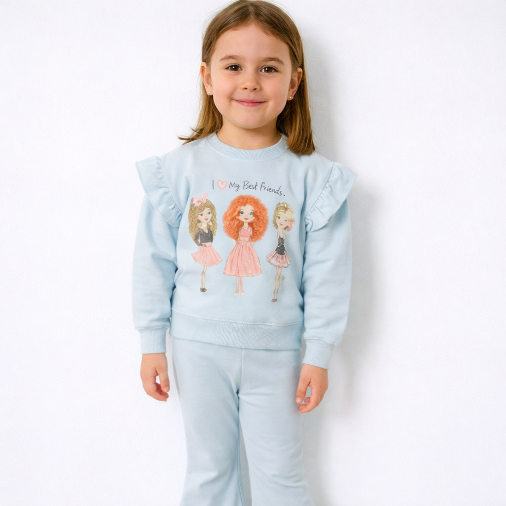 Σετ κοριτσιού σε γαλάζιο χρώμα με μπλούζα φούτερ και παντελόνι καμπάνα. Η μπλούζα διαθέτει παιχνιδιάρικο τύπωμα με φιγούρες και διακοσμητικά βολάν στους ώμους, ενώ το παντελόνι προσφέρει άνετη εφαρμογή και μοντέρνα γραμμή. Ιδανικό για καθημερινές εμφανίσεις με στυλ και άνεση.Διαθέσιμο για 1-4 ετών .