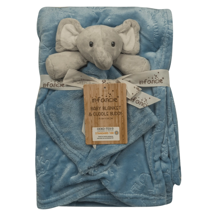 Γλυκιά βρεφική κουβέρτα μπλε με ελεφαντάκι . Είναι προσεκτικά διπλωμένη, διακοσμημένη με φιόγκο και λούτρινο ελεφαντάκι στο επάνω μέρος – ιδανική για δώρο ή για καθημερινή αγκαλιά.