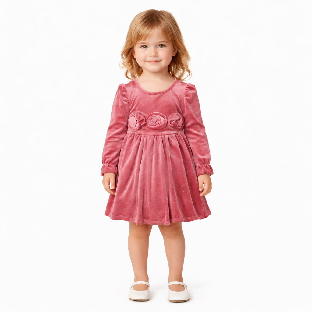 Ένα ονειρεμένο φόρεμα για μικρές πριγκίπισσες! Σε υπέροχη μωβ-λιλά απόχρωση, κατασκευασμένο από απαλό βελούδο, προσφέρει άνεση και ζεστασιά, ιδανικό για ιδιαίτερες περιστάσεις αλλά και γιορτινές εμφανίσεις.Το μπροστινό μέρος στολίζεται με χαριτωμένα μπουμπουκάκια 3D, προσθέτοντας παιχνιδιάρικη και ρομαντική νότα που θα λατρέψουν τα παιδιά. Η άνετη γραμμή του επιτρέπει ελευθερία κινήσεων, ενώ το ύφασμα είναι φιλικό προς την ευαίσθητη παιδική επιδερμίδα.