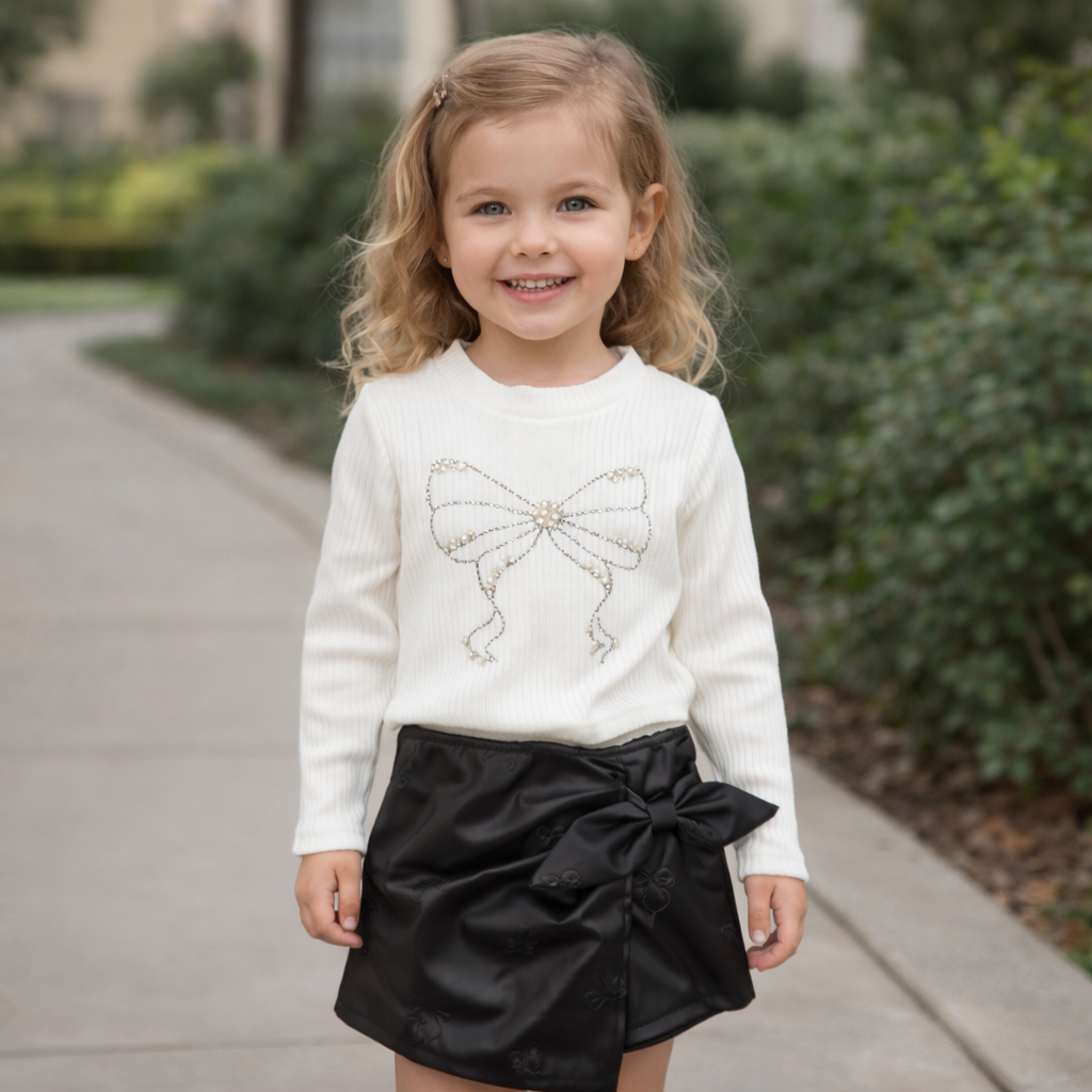 Το σύνολο συνδυάζεται με λευκό μπλουζάκι διακοσμημένο με πεταλούδα στο μπροστινό μέρος, στολισμένη με στρας και πέρλες για διακριτική λάμψη και κοριτσίστικη γλυκύτητα.